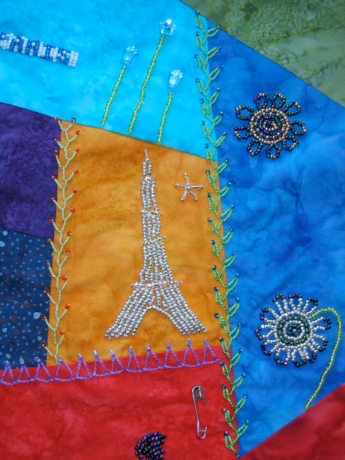 I wanted to post a few pics of what I’ve been working. I love Paris, so I thought I’d do a mini-quilt saying so. It’s very challenging figuring out what goes were and everything I should include but it’s also so much fun. I’m really love beading and I’ve been looking through all my old Quilting Art’s magazines. They are an incredible resource for beading techniques. I can’t wait till Deana Hartman comes to the guild in October.