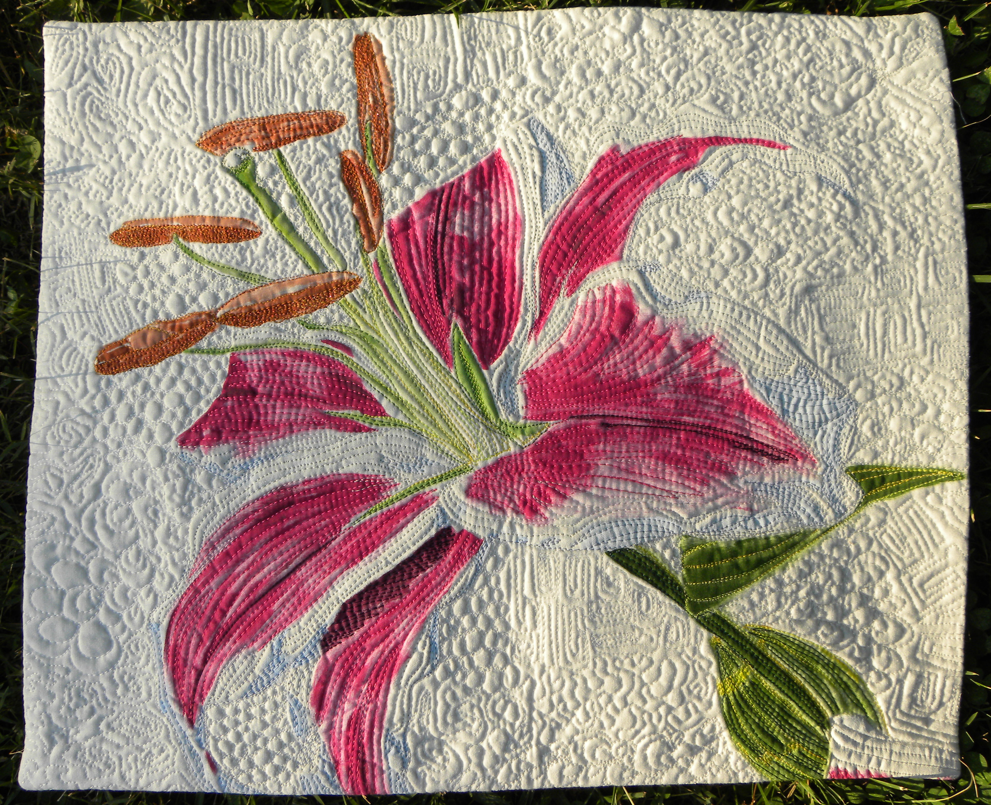 I had a lot of fun with this piece. I did a minimal paint job on the lily and did a lot of work filling in with stitching. I also really enjoyed doing all the background quilting.