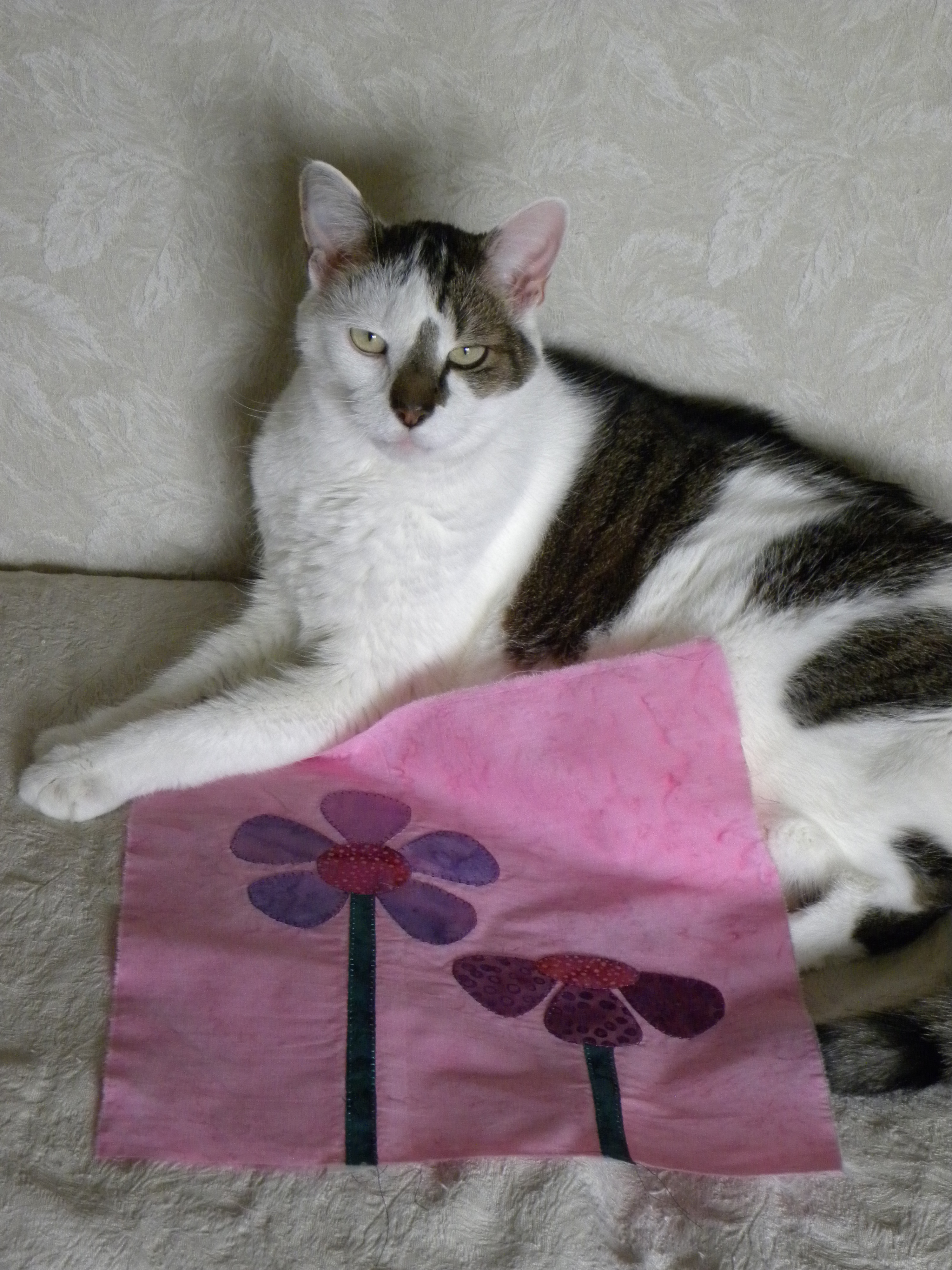 Here’s my boy Tootie with the September block of the month for the Charlotte Quilters’ Guild. I’ve already gotten one of the August blocks from a member who will not be able to attend. I’m hoping for record participation again this month.