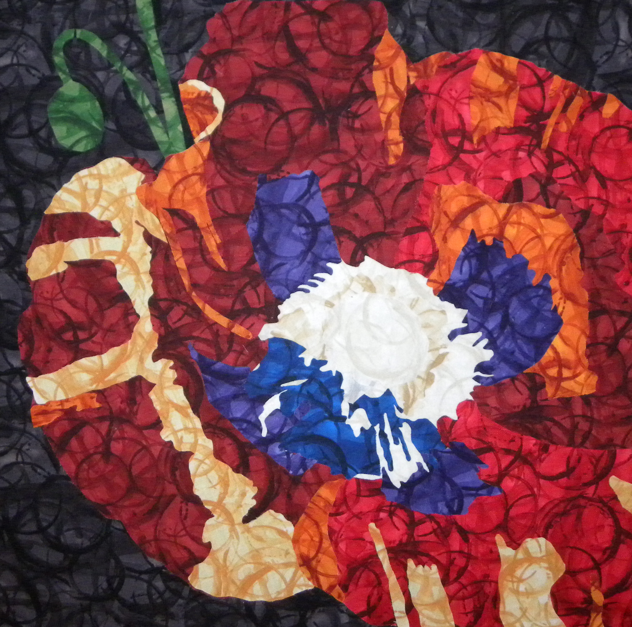 Here is my latest project, the poppy. I worked most of the weekend cutting out the pieces to be fused. I still have a few other pieces to add to the petals but that should be easy to do. Last night I took a break from the piece. I hope to start thread painting later this week.