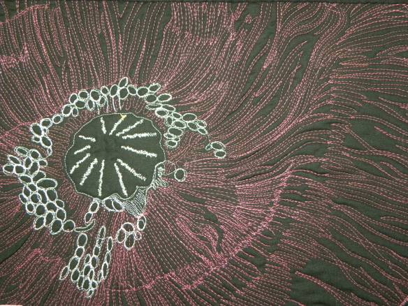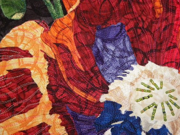Pretty Little Poppy is finally finished and on it’s way to Greenville, SC to Studio E. I created it for as an art challenge for a new line of fabrics by Studio E. If it is chosen it will be displayed at their booth at the Houston show next month. I was thrilled to be included in this art challenge.