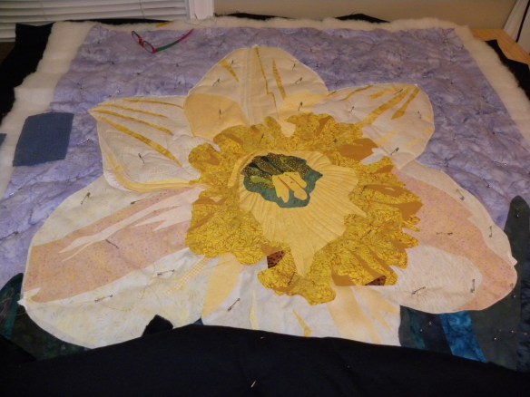 I finished fusing this daffodil project last week. It’s been hanging on my design wall for months. I did well at the Cabarrus Quilt Show and thought it’s really time to start. I began in the center as I usually do. I did a bit of work on the center area and then I did this….