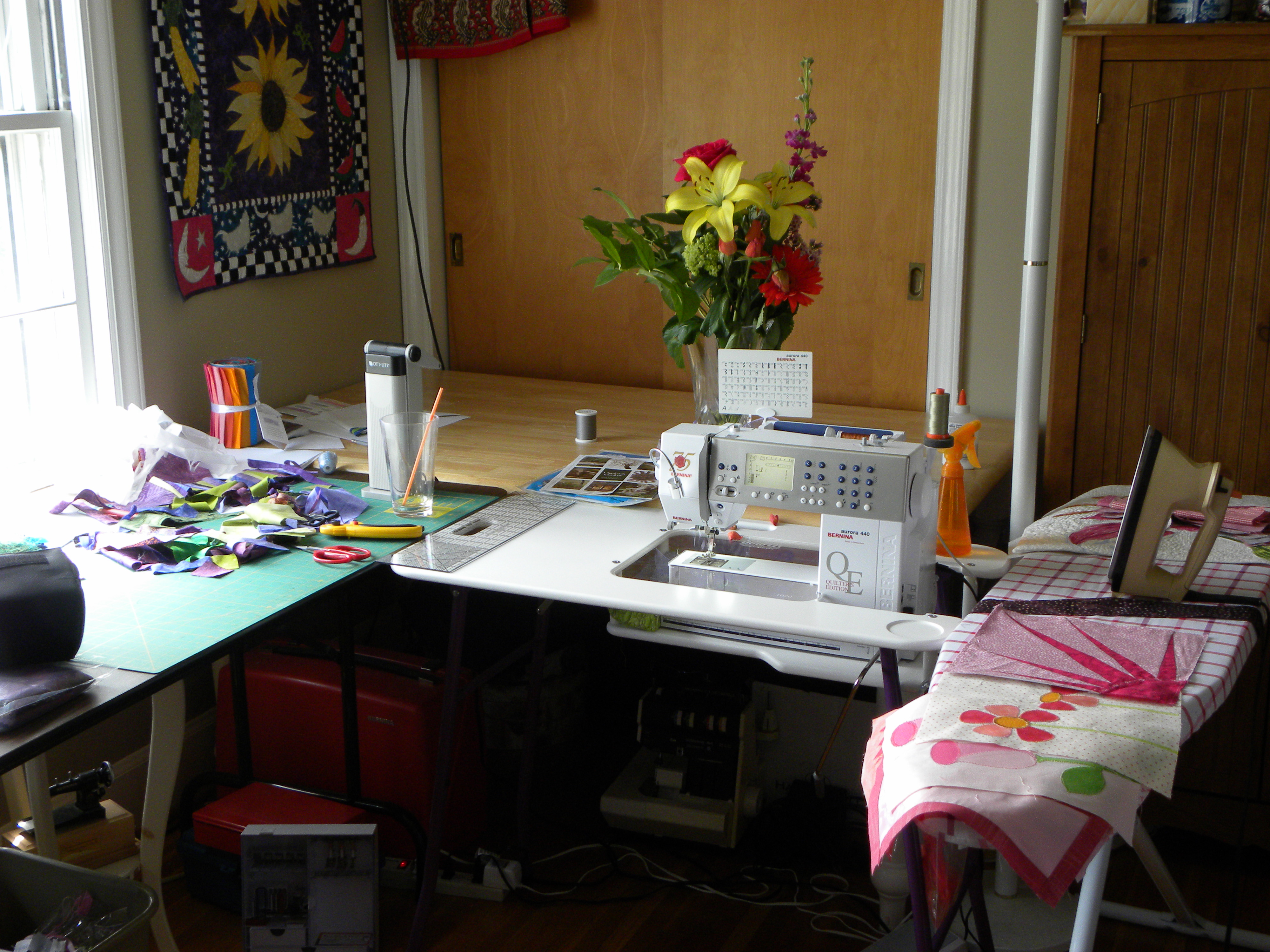 These three tables form an upside down “L”. And, on the right, is my ironing board. This configuration works pretty well. It’s especially useful when I’m working on a large quilt and when I’m free motion quilting.