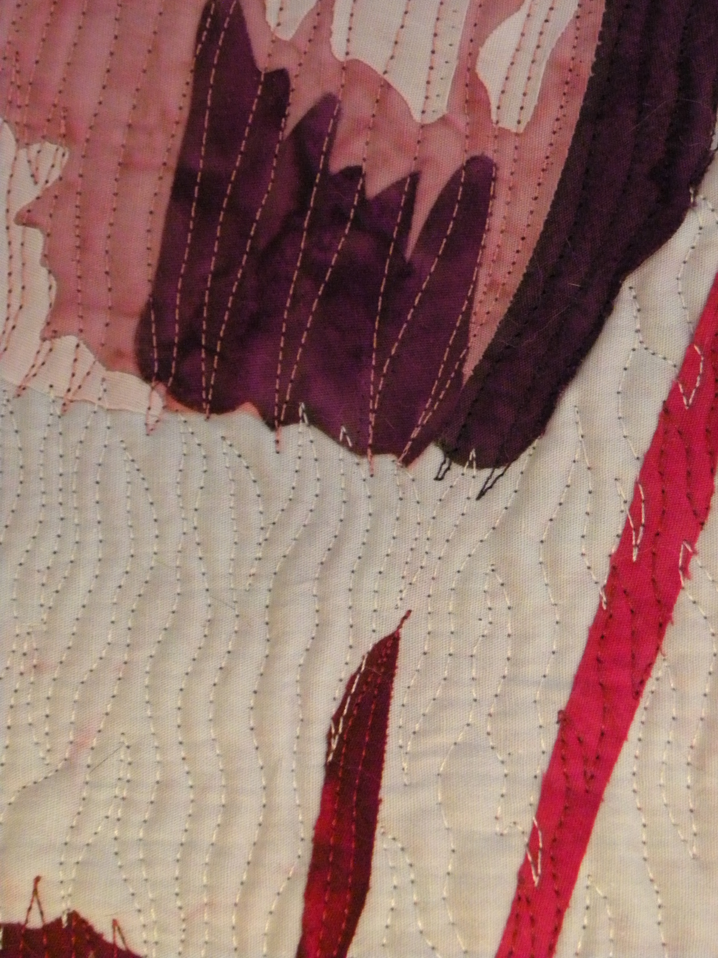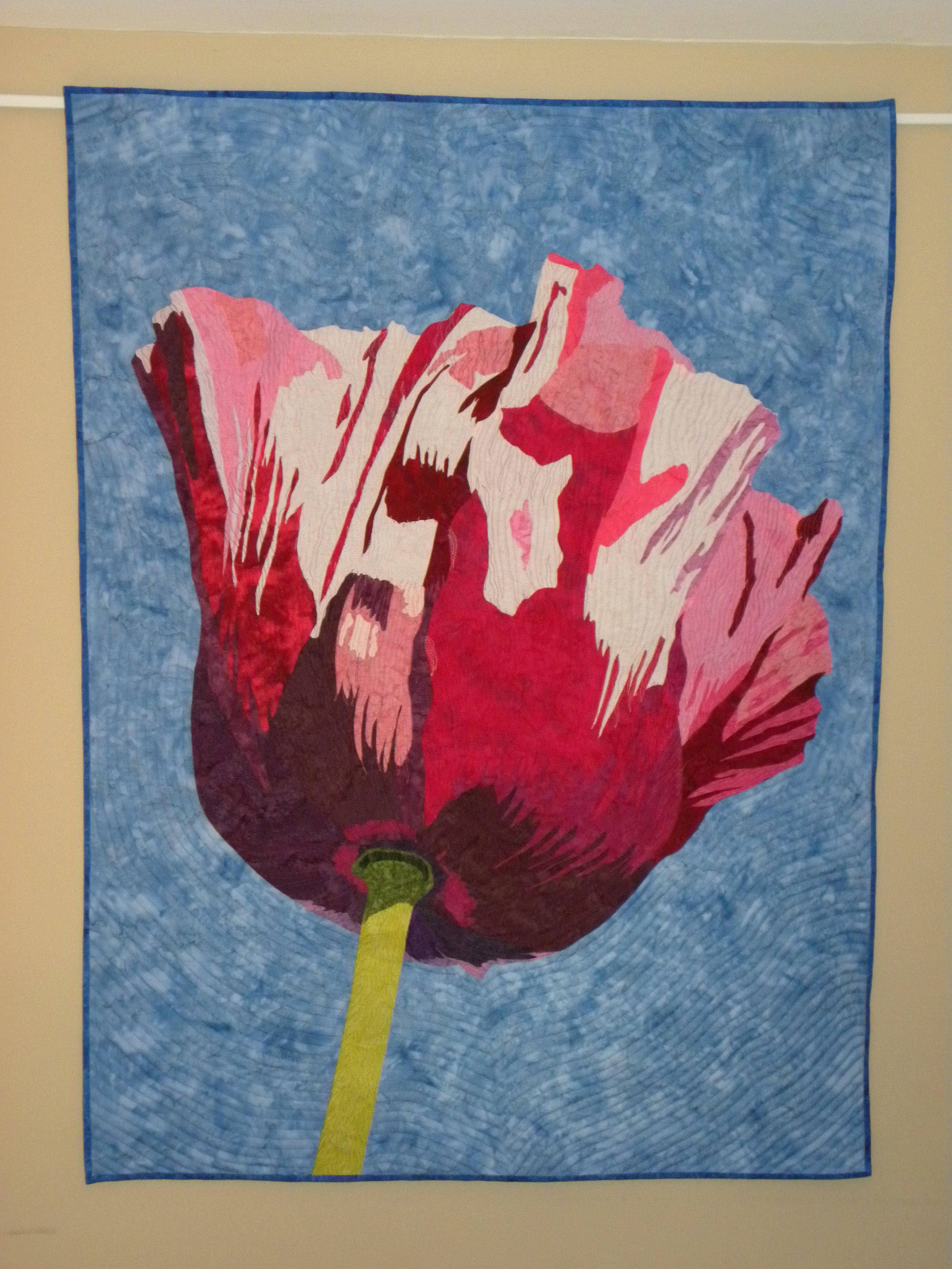 Here is a detail shot. This piece was raw edge applique and free motion quilted. I thoroughly enjoyed choosing all the fabrics for this one. They ranged from red to pink to white to purple to violet. Plus some green for the stem. I shot all the photos of the poppies at Wing Haven in Myers Park.