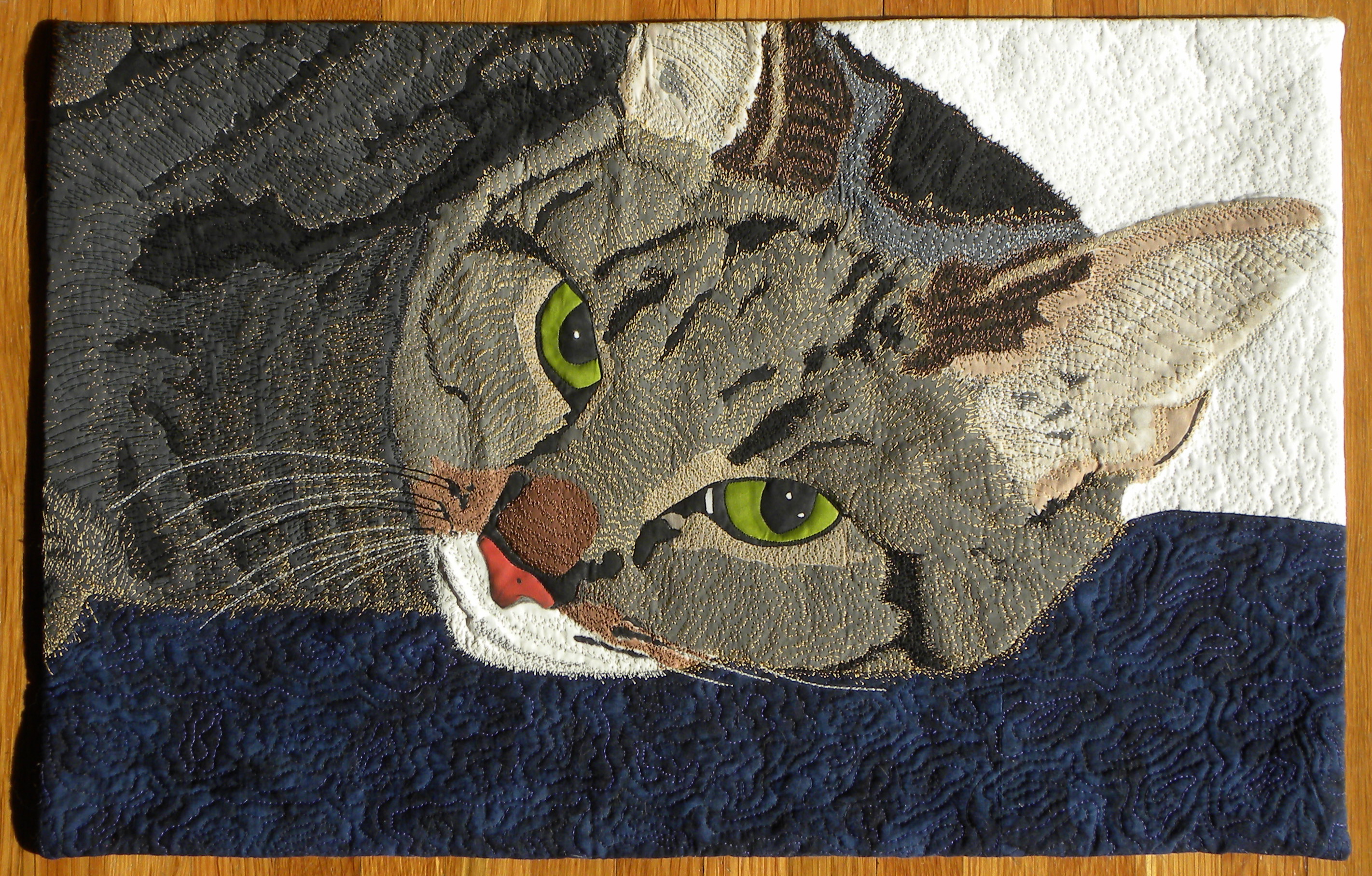 Yes, she rules the house and loves it. This piece was whole cloth painted, thread painted, the blue area is hand applique and free motion quilted. I had so much fun working on her eyes.