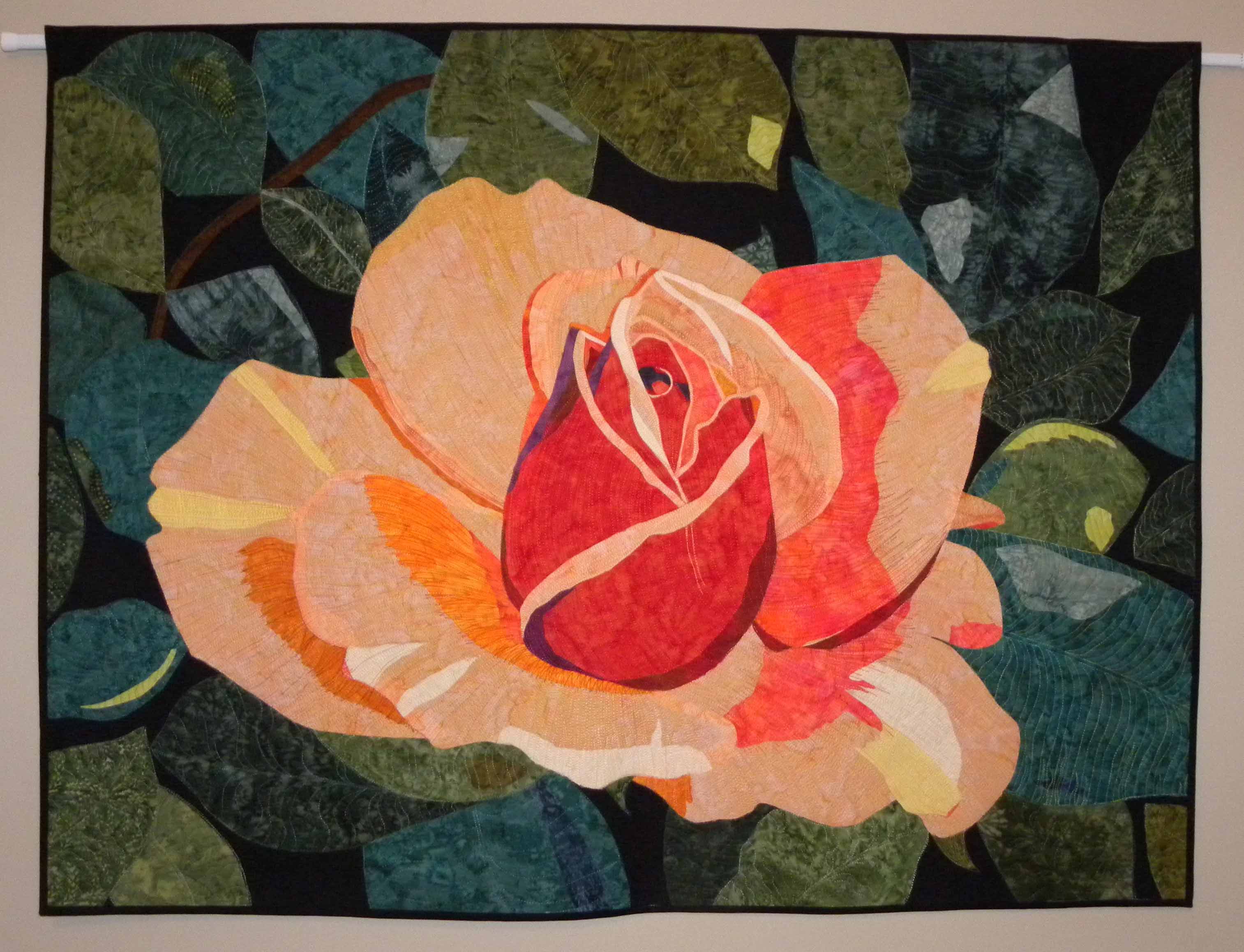 I saw this peach colored rose one Sunday afternoon after visiting my sister Patty in Tega Cay. I stopped at the small rose garden on Gold Hill Road to take some pictures. It was late spring and the roses were in full bloom. There were so many beautiful roses in all colors but this peach rose jumped at me. It was STUNNING! I’ve never made a applique rose quilt before and I was up for the challenge. And, what a challenge it was. I don’t think I could ever have enough peachy / orange fabric for this flower. I did the best I could and of course I had to include purple….purple should be in all quilts!